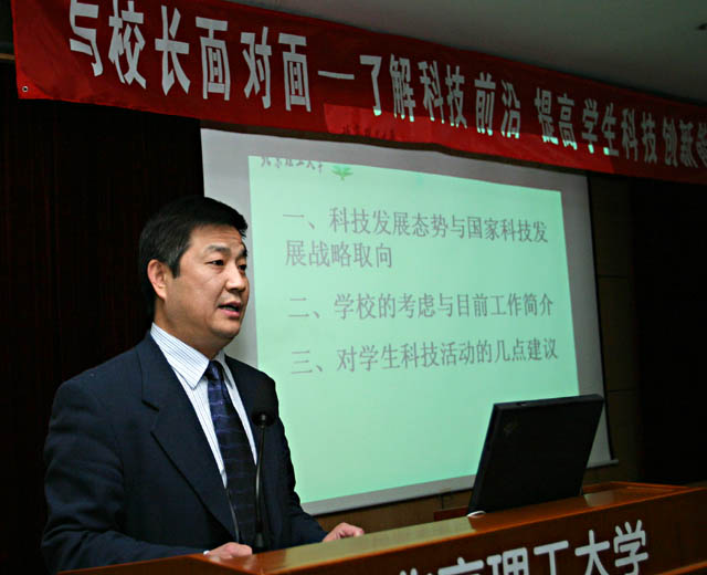 近年来,我校大学生课外科技、学术活动不断发展。但同学们对当代科技前沿的了解、对相关学术论文及其它学术研究材料的组织等方面还存在较大的欠缺。鉴于此,赵长禄给大家详细讲解了当代科技前沿的发展情况,我校科技发展状况及学生在申报课题等方面的相关知识;并对我校学生课外科技、学术创新活动提出了新的要求。