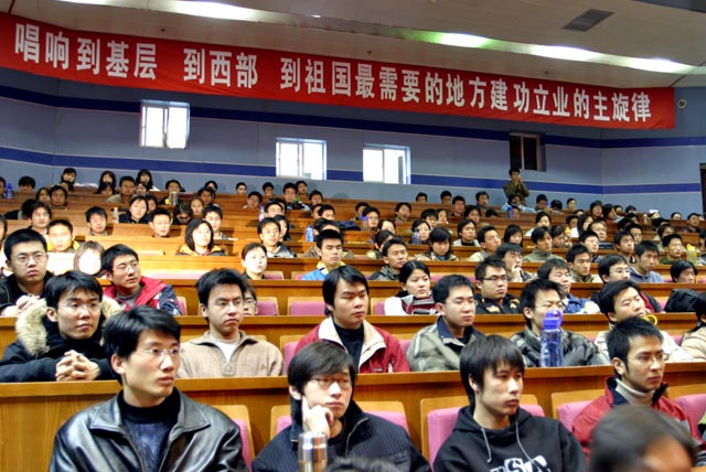 本次报告会的召开,一是为了贯彻落实党的十五届六中全会精神,在广大同学中间宣传“建设社会主义新农村”的重大意义;二是源于广大毕业生对北京市选拔“村官”工作的极大热情。离报名截止日期还有一周,米兰milan官方网站共有279 名毕业生申请村支部书记助理、村主任助理职位,占北京市今年选拔计划总数的13.95%。其中本科生(含双学位)188人,占67.4%;研究生79人,占28.3%;高职生12人,占4.3%。