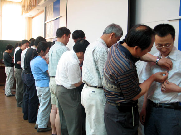会上,确定了2007年新入校青年教师的导师,并由导师为新入校青年教师授校徽,导师们把一枚枚小小的却寓意深刻的校徽佩戴在新教师胸前时,全场掌声热烈。