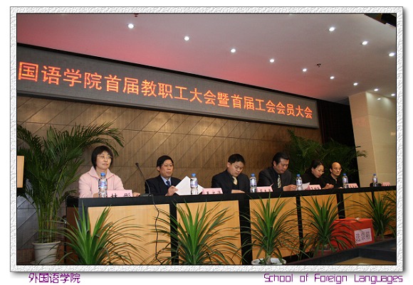 2007年1月24日,外国语学院首届教职工大会暨首届工会会员大会闭幕式在校图书馆一层报告厅举行。校工会常务副主席蔡本睿同志出席了闭幕式,外国语学院党委书记王文清同志,院长吴树敬同志,副院长林彤同志,德语系主任姜爱红同志,外国语言学及应用语言学学科带头人陈大明同志在主席台就坐。学院副书记、副院长吴文君同志,副院长李京廉同志,副院长谭利群同志及大会主席团成员在会场前排就坐,外国语学院全体教职工参加了闭幕式。