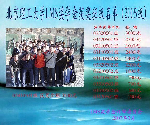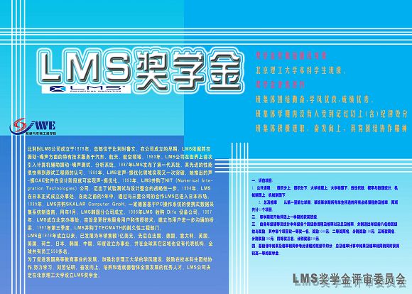 LMS奖学金是比利时LMS国际公司于2004年在我校设立的班级奖学金,主要奖励我校团结勤奋、学风优良、成绩优秀、积极进取、奋发向上、具有团结协作精神的本科班集体。此前已有60多个本科班级获得此项奖学金。