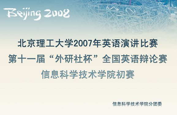 2007年4月11日晚7点,信息科学技术学院承办的全校英语演讲比赛院级选拔赛在4号楼233教室举行。本次比赛特别邀请了外国语学院大学英语部栗欣老师和张渊老师担当评委,分团委副书记高路老师主持并参加了此次比赛。