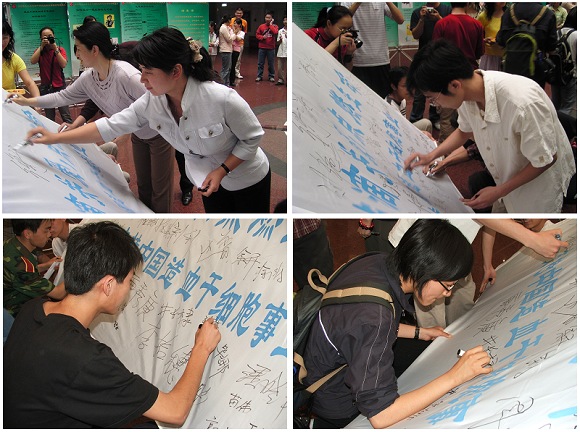 最后,张国成同学宣读了造血干细胞采集活动倡议书,同学们纷纷在倡议旗帜上签下了自己的名字,表达了志愿捐献造血干细胞的意愿。此次倡议活动的成功举行标志着第四届米兰milan官方网站第四届造血干细胞捐献活动正式拉开帷幕,并为即将在5月13日举行的捐献活动打下了一个良好的基础。