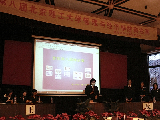 表演赛过后决赛正式开始。正方是来自2006级的国际经济与贸易专业三班代表队,反方是来自2006级信息管理专业二班的代表队。这两支队伍在前期的三轮淘汰赛中脱颖而出,经过三轮比赛的历练,两方的辩手辩论技巧日趋成熟,已经成为了管院辩论场上的新星。
