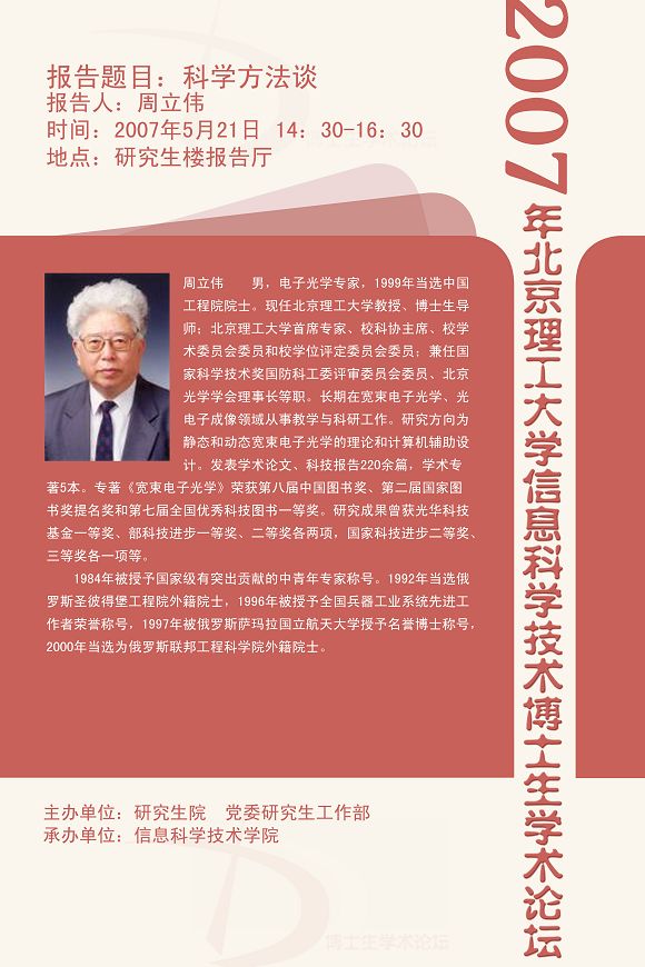 2007年5月21日下午,周立伟院士在研究生楼报告厅(101教室)进行了一场题为《科学研究方法谈》的大会报告。