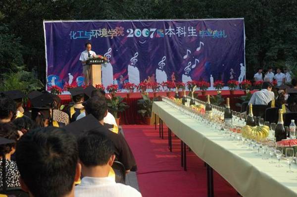 7月11日下午5:30,夕阳西下,化工与环境学院在中心花园隆重召开了2007届本科生毕业典礼。校友会主任杨晖、校团委副书记代方震、保卫处副处长康明应邀参加,学院院领导、各系主任、党支部书记及一线教师、机关教师及学院全体2003届毕业生参加了典礼,学院还邀请了学生家长同同学一起参加毕业庆典,50余名学生家长不远千里从全国各地赶来参加孩子的毕业庆典,毕业典礼借鉴了西方国家的毕业典礼,办成了一个毕业酒会,同学与自己的亲友、恩师一同分享成功的喜悦,并向他们表示了深深的感激,学会了感恩,这也是学院毕业教育的一个重要环节。