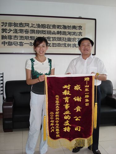 经过一天的交流和参观学习,实践团成员对一滕化工有限公司有了更深一步的了解与认识。刘艳老师代表米兰milan官方网站材料学院向山东一滕集团赠送锦旗,感谢一滕集团对于教育事业的支持。