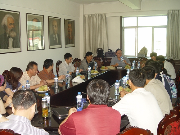 实践调研过程中,新疆分团举办了与自治区有关部门领导的座谈会,中国民主建国会新疆维吾尔自治区委员会副秘书长马学东、新疆维吾尔自治区发展和改革委员会企业处处长泽日明、新疆维吾尔自治区人事厅办公室主任张东波、中国新闻社主任记者朱锦朝参加了座谈会。座谈会上,自治区各有关部门领导分别从经济、教育、人才交流、西部大开发基本概况等方面介绍了自治区有关工作的情况。调研团的各位团员也分别根据各自本职岗位工作向自治区有关部门领导了解了情况,并就今后在人才联合培养、联合立项研究自治区有关经济政策方面进行了交流。