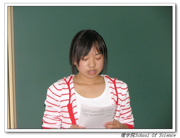 随后2006级统计专业的吴珊同学代表高年级学生发言,她介绍大学的学习尤其注重方法,在宽松的学习氛围里,确定一个目标或订一个计划并努力去完成它可能会使学习更加高效,同时在学习上也许会碰到一些挫折,但不要气馁,更不要放弃,可能需要投入更多的时间来尽早走出这种状态。