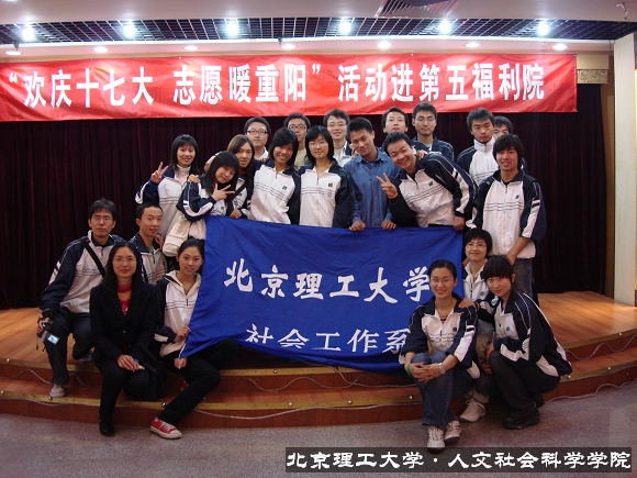 10月18日上午,米兰milan官方网站人文社会科学学院2005级社会工作专业2班19名学生在刘颖老师和于建敏老师的带领下来到了北京市第五福利院,与北京市团市委一起组织了“欢庆十七大,志愿促和谐”大型志愿活动服务,为第五福利院的老人们送去节日的慰问与祝福。