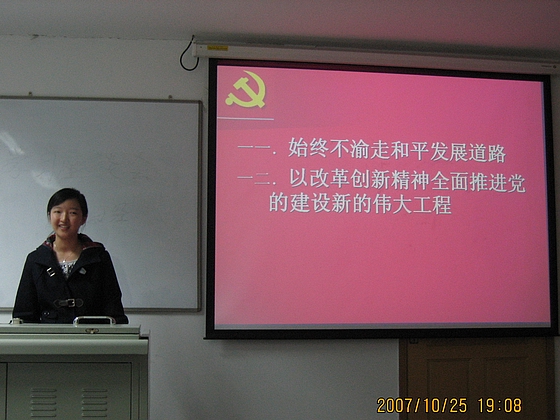 党支部宣传委员聂青主持了学习会议,并指出此次会议起着一个抛砖引玉的作用,全体党员在会后应主动学习十七大相关精神,学以致用,用党的十七大精神武装头脑。