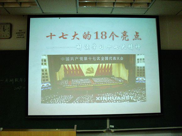 高级部的党课分别由高级部部长刘伟(《社会主义核心价值体系建设》)和副部长李佳益 (《十七大的18个亮点——解读学习十七大精神》)讲授。学习过程中,同学们积极思考,认真听讲,授课达到了较好的效果。