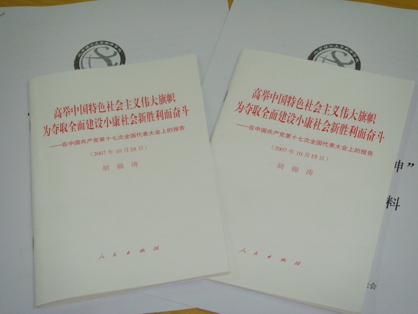 在接下来的时间里,组长李超同学组织学员们具体学习了胡锦涛总书记报告中“深入贯彻科学发展观”、“开创国际和军队现代化建设新局面”等专题内容。
