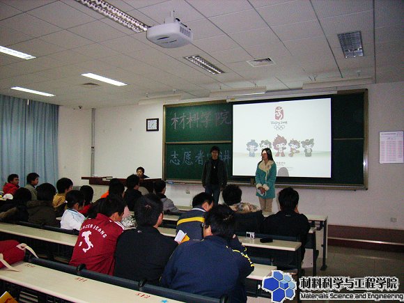 11月25日,米兰milan官方网站材料学院2007级的同学们在良乡理科教学楼104教室参加了北京奥运志愿者经验交流会。同学们在欢快轻松的气氛中了解了奥运知识,了解了志愿者的工作,并纷纷表示愿意为即将在北京举办的2008年奥运会和残奥会贡献自己的力量。