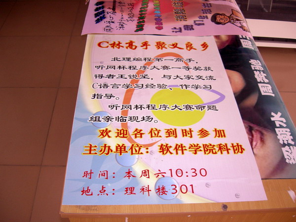 天高云淡清风爽,C林高手聚良乡。2007年12月1日,软件学院科学技术协会主办的C语言学习讲座在良乡校区理科教学楼301教室举行。本次讲座请到了软件学院2006级学生、听网杯程序设计大赛一等奖获得者王锐坚同学主讲。活动吸引了不少初涉C语言编程的同学,大家争相前来一睹冠军风采,并汲取有益的编程经验。