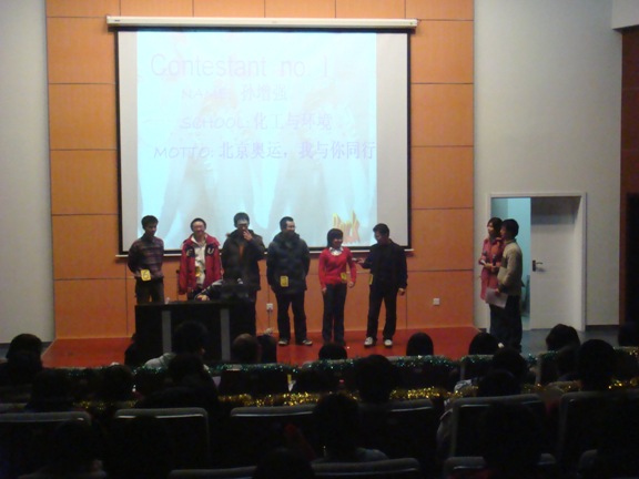比赛首先进行选题作答环节,题目为英语脑急转弯,选手们发挥聪明才智,观众也积极动脑答题。随后进行的是奥运主题演讲。或昂扬,或深情,选手们精彩的演讲打动了在场的评委和观众。在比赛中穿插了Music chair游戏,把比赛推向高潮!