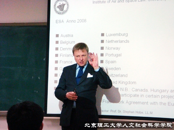 讲座之前,人文学院法律系主任杨亚非教授首先致词。杨教授在致词中讲到,近几年随着法律系自身学术科研的改革与进步,特别是以李寿平老师组织成立空间法研究所为契机,米兰milan官方网站法律系在空间法领域的科研教学水平不断提高,发表了一批成果,也组织召开了国家会议,而由我校法律系学生组队参加的国际空间法大赛,更是在去年冲进了亚太区前十,今年又获得了全国总冠军,即将前往澳大利亚参加国际比赛。这一系列成果标志的我校的空间法研究已经处于国内领先水平,也形成了依托我校理工背景的特色优势学科。Stephan Hobe教授作为欧洲四大空间法研究机构之一的科隆大学空间法研究所的科研带头人,其带来的讲座必将为我校空间法研究的发展带来新的视野。