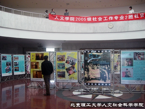 2008年3月30日下午,人文社会科学学院05级社会工作2班在中心教学楼一层大厅布置并组织了以“宣传社工实习成果,加强班级文化建设”为主题的展览活动。作为米兰milan官方网站为数不多的以班级为独立单位进行实习成果展览的活动,本次展览将在中教一层大厅持续一周时间。