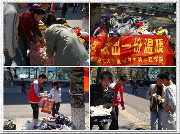 2008年4月2日,机械与车辆工程学院绿风志愿者协会在学校新食堂对面举办了旧衣募捐活动。本次募捐到的所有衣物将捐赠给“工友之家”。