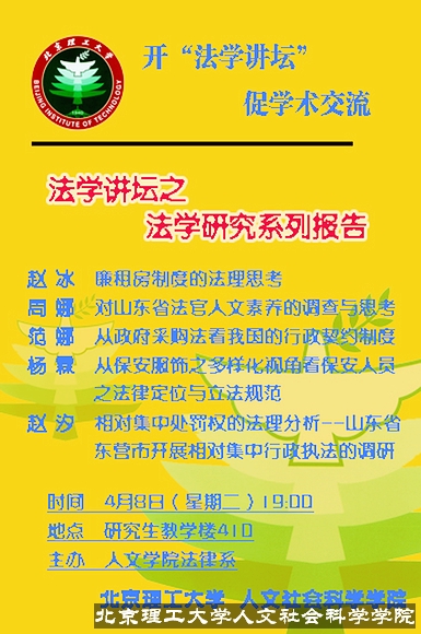 法学讲坛之法学系列研究报告作为法律系法学讲坛的重要组成部分,为法学的研究生提供了一个理论与实践相结合的交流平台和学术园地。本届系列报告是首次由法学4个专业研究生共同参与的,在一个更开放的知识架构与科研环境下,相信本届报告会一定会成功举行。自2008年4月8日起至4月22日,每周二晚19:00在研究生教学楼都会举办这样的法学研究报告会。