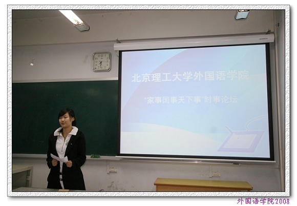本次时事论坛由外国语学院共产主义实践会承办,既是外语文化节的系列活动也是外国语学院理论学习创新活动。活动采用同学们喜闻乐见的论坛形式,以外国语学院预备党员为主讲人,带领引导同学们学习党的十七大精神,加深学生特别是学生党员、预备党员及入党积极分子对时事的关注和思考。