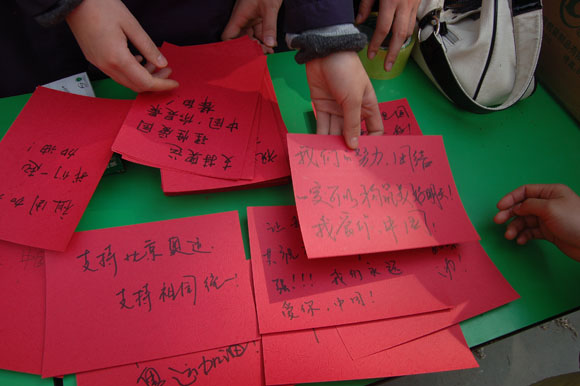 首先进行的是填写爱心祝福卡片的活动,同学们把自己对祖国的热爱之情,把对海外华人爱国行动的支持写在了主办方为他们准备的精美卡片上,连同自己捐献的国旗一起送给海外爱国同胞。