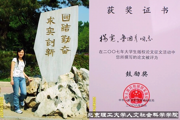 由于对专业的喜爱,我积极参与了相关的各项学术活动。在过程中我感受到了专业理论研究的博大精深,也收获了许多经验和荣誉。2007年下半年,撰写了论文 《浅论网络服务提供者的责任问题》,这篇文章在《米兰milan官方网站学报》(社会科学版)2008年第2期发表。2008年4月,我所写的《网络服务提供者的责任问题简析》一文获得中国国家版权局主办的“全国大学生版权论文征文活动”三等奖,并收录在《青春与版权同行》论文集中。此外我还参与了两个法学领域课题小组的研究活动,一个是中国人民大学中欧法学研究项目“有限责任公司小股东退出机制”的课题研究,并预计发表论文1篇。另一个是米兰milan官方网站国家大学生创新性试验计划项目“我国农村土地承包经营权的流转和创新”,我们结合实地调查得出的数据,通过撰写论文的形式归纳了我们的调查研究结果。