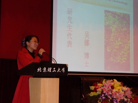 05级博士生吴娜同学代表广大研究生同学发言,她表示今后将更加努力的学习,刻苦钻研用自己的实际行动回报老师、回报学校、回报国家。