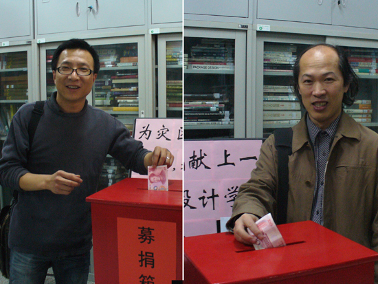 5月12日发生在四川省的特大地震灾害牵动着全国人民的心。我校设计艺术学院广大师生密切关注灾区灾情,心系灾区人民,积极支援抗震救灾。为了方便教师捐助赈灾,设计艺术学院14日下午2时开始在学院资料室设置募捐箱。截止当日下午5时,已经募集到善款13400元。分党委书记李莲、院长张乃仁带头捐款,短短3个小时内就有59位教师慷慨解囊,人均捐款220元,超过许多教师一天的工资。目前捐款活动仍在继续。