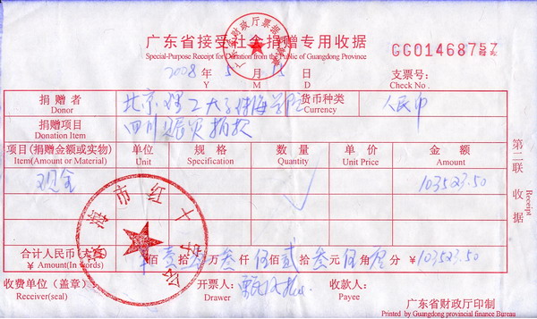 截止到15日14时,珠海学员院已募得救灾款项103523.5元,此笔捐款已于15日下午交珠海市红十字会并将迅速汇往四川灾区。