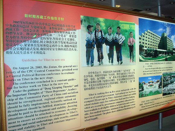 这两句话集中概括了建国以来西藏翻天覆地的变化。在离开了一幅幅黑白却依旧鲜血淋漓的照片之后,展现在学生党员眼前的是共产党和新中国带给西藏人民的新生活。