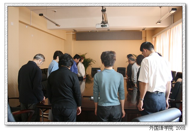 2008年5月19日14时28分,沉痛悼念四川汶川大地震遇难同胞,外国语学院机关领导和教师为在地震中遇难者肃立默哀3分钟。