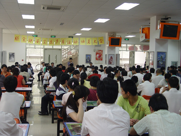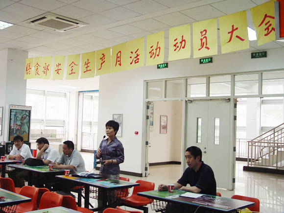 会议由张小云副处长主持,会议首先由张书信处长发言,张处长说膳食部将以“治理隐患、防范事故、优质服务”为主题,以食品安全为重点,组织实施一系列活动,提高全体员工的安全意识,消除安全生产及食品卫生隐患,实现平安奥运目标。张处长还提出了几点要求,请大家共同贯彻落实。①提高认识,加强领导。充分认识当前安全生产工作的重要性和艰巨性,进一步增强责任感和使命感,做好安全生产工作,确保奥运安全。②加强宣传教育。各食堂要充分利用班前会、例会的时间积极扎实推进和落实安全生产月的各项要求,处办公室和各单位要积极利用宣传栏、网络、伙食简报等媒体加强宣传报道努力创造人人关心和参与的新局面。③认真检查、加强监督检查、全面开展安全生产大落实活动。结合本部门、本岗位的具体工作,全体人员认真学习并贯彻落实两标一体质量认证的要求,具体的安全生产岗位责任制和安全操作规程就近上墙,供具体的操作人员学习、执行和遵守。结合全校性安全大检查,各单位应积极做好隐患排查和整改工作。巫后新书记对大家也提出了一些要求,在思想上要高度重视,加强员工培训,加强防范工作,各个单位要狠抓落实,每个人都应该严格按照操作规程工作,领导要经常检查安全问题。膳食部质检科贾学刚科长也介绍了近期的检查工作,随着气温的回升,冷荤间中的凉拌菜检查合格率有所下降,今后将加大处罚力度,容器的消毒和使用要严格,食品制作计划要严谨周密。各食堂应经常清洗排烟罩、清除死角、配齐点火枪、消火栓要定点摆放。
