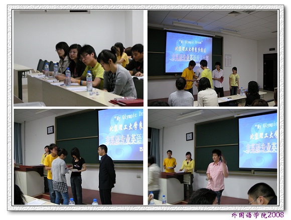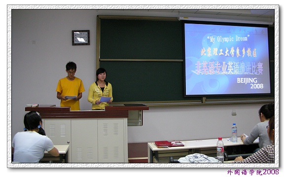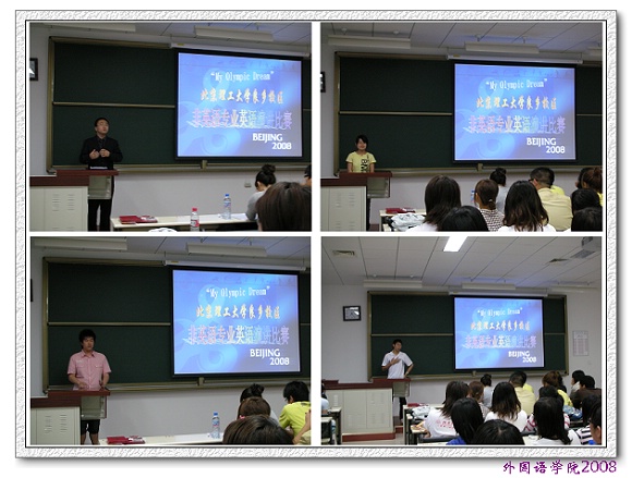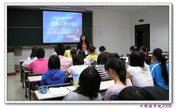 本次比赛是为了营造大学英语学习氛围,加强校园文化建设,结合2008年北京奥运会的契机而举办的比赛,良乡校区2007级本科生积极参与,经过初赛阶段的角逐,每名参赛选手都表现出非凡的表现力和流畅的语言表达能力。