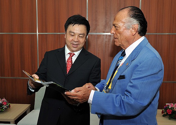 阿科斯塔博士向场馆主任杨宾赠送了资料《VolleyWorld》,以表达国际排联对米兰场馆筹备工作的感谢。