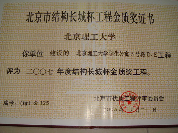 良乡校区3号学生公寓D、E工程证书