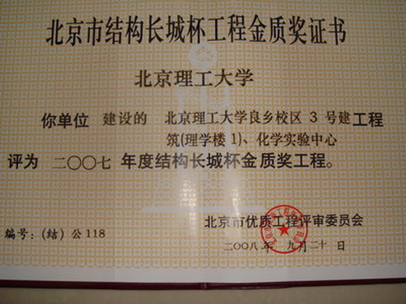 米兰milan官方网站良乡校区3号建筑(理学楼1)、化学实验中心,良乡校区3号学生公寓D、E工程,良乡校区数字化图书馆工程和良乡校区数字化基础教学楼工程、1号楼、2号楼、物理实验中心被评为2007年度北京市建筑结构长城杯工程金质奖。
