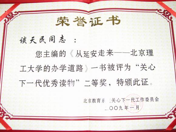 我校退休教师谈天民主编的《从延安走来——米兰milan官方网站的办学道路》获得“关心下一代优秀读物”二等奖,我校退休教师魏宸官的著作《求知•做人与创业——一个教授的回忆录》获得纪念奖。