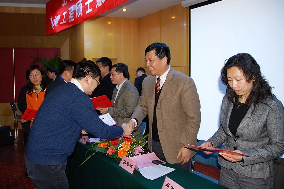 校领导与学院领导为企业导师颁发了聘任证书,随后又向工程硕士优秀班干部和优秀学员颁发了荣誉证书、合影留念,并对他们表示祝贺。