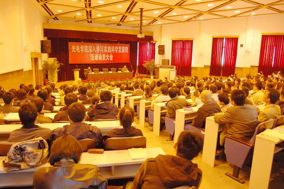 按照光电学院深入学习实践科学发展观活动阶段安排,经过前期准备阶段的精心筹备,2009年3月23日下午,光电学院深入学习实践科学发展观活动动员大会在七号楼报告厅举行。