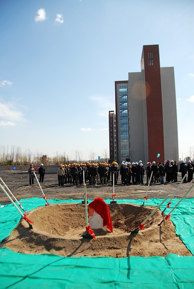 最后李和章副校长宣布良乡校区1号宿舍楼正式开工,参会人员共同为1号宿舍楼进行了奠基。