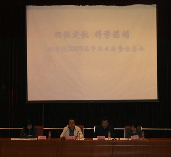 4月10日下午,理学院在中教报告厅召开了2009届毕业生形势报告会,理学院党委书记何明、院长胡长文、党委副书记副院长姜艳、副院长胡海云、全体本科和硕士、博士毕业生参加了本次报告会。报告会由党委书记何明主持。