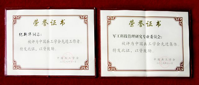 在刚刚结束的中国兵工学会第七次全国会员代表大会上,挂靠在我院的军工科技管理研究专业委员会被评为先进集体;总干事纪新华同志被评为先进个人。