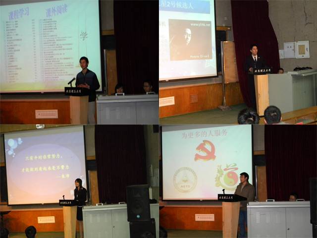 经过激烈的初赛评比,选出“学习之星”候选人3人,“工作之星”候选人5人,“体育之星”候选人2人,“文艺之星”候选人3人。候选人中的06级,07级的本科生以及研究生,都在平时的学习,生活和工作等各个方面都有不俗的成绩,他们是学生中的佼佼者,而今天,他们都为了同一个荣誉,为了证明自己、超越自己而走上这个平台。