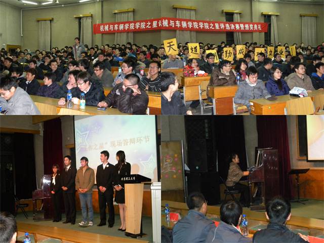 2009年12月20日晚7点,机械与车辆学院分团委在7号楼108举办了机械与车辆学院第六届“学院之星”评选决赛暨颁奖典礼活动。学院分团委的老师和四名学生代表一起担任评委。“学习之星”、“工作之星”、“体育之星”、“文艺之星”,十五位同学同台竞技,一展当代米兰milan官方网站大学生风采,为同学们奉献了一道精神盛宴。