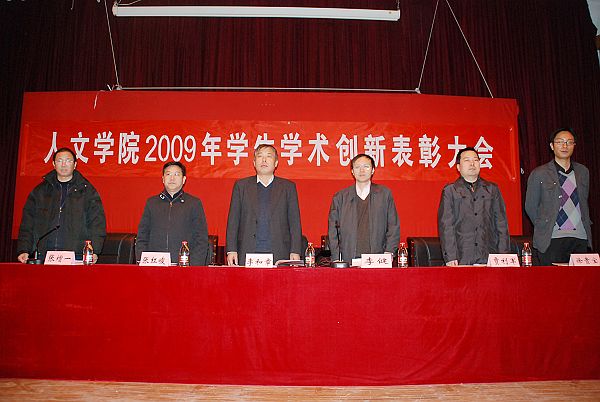 2010年1月11日人文学院全体学生在七号楼报告厅召开2009年学生学术创新表彰大会。出席表彰大会的领导有学校党委副书记、副校长李和章教授、人文学院院长李健教授、党委书记张红峻教授、学院副院长张增一教授、副院长贾利军老师、党委副书记副院长徐贵宝老师。会议由分团委书记贾效明老师主持。