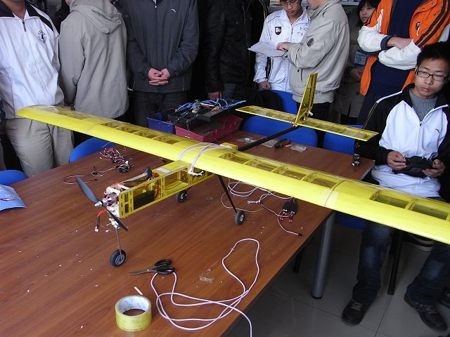 11点30分,飞机准备完毕,随着发动机强劲有力的声音,飞天雄鹰离地升空。该机是09年全国航模锦标赛载重比赛的参赛飞机,由08级队员在寒假集训期间总装完成。此次试飞是对寒假工作成果的检验。之后这架飞机将供08、09级队员练习使用。