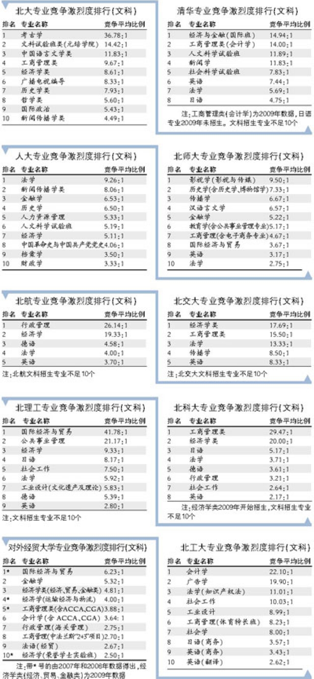 本版“竞争平均比例”为2007年至2009年文科第一志愿第一专业报考人数与该专业计划招收人数的平均比例。