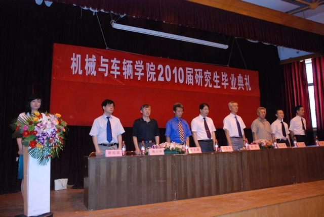 7月5日上午,机械与车辆学院2010届研究生毕业典礼在七号教学楼报告厅隆重举行。机械与车辆学院院长项昌乐、分党委书记张英、常务副院长唐水源、副院长左正兴、胡纪滨、左建华,校友张均享、车辆工程系主任苑士华教授、部分学生家长和全体2010届毕业研究生共同出席了毕业典礼。