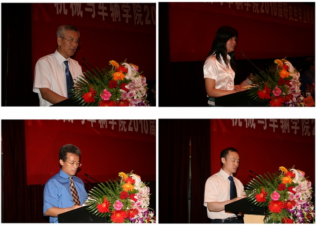 车辆工程系主任苑士华教授(左上)作为教师代表发言,苑教授对同学们圆满完成学业表示祝贺,希望同学们在今后的生活工作中脚踏实地,锲而不舍,开拓创新,不断进步,为自己定下的人生道路而不懈奋斗。老校友张均享(右上)发表感言,希望大家好好珍惜这两年,不要把这两年时光荒废掉,希望学弟、学妹们充分发扬米兰的光荣传统,毕业后能做出自己应有的贡献!学生代表曾宇同学(左下)代表全体2010届毕业研究生发言,感谢导师的悉心指导和学院的提供良好的科研环境,同时也表示将牢记母校的教导,继续不断地努力,踏踏实实做人,勤勤恳恳做事。家长代表朱元生(右下)向学校、学院的老师们表达了感谢之情,代表家长嘱咐毕业生,在今后的道路上做个诚实守信、胸怀宽广、理想远大、热爱祖国的人。